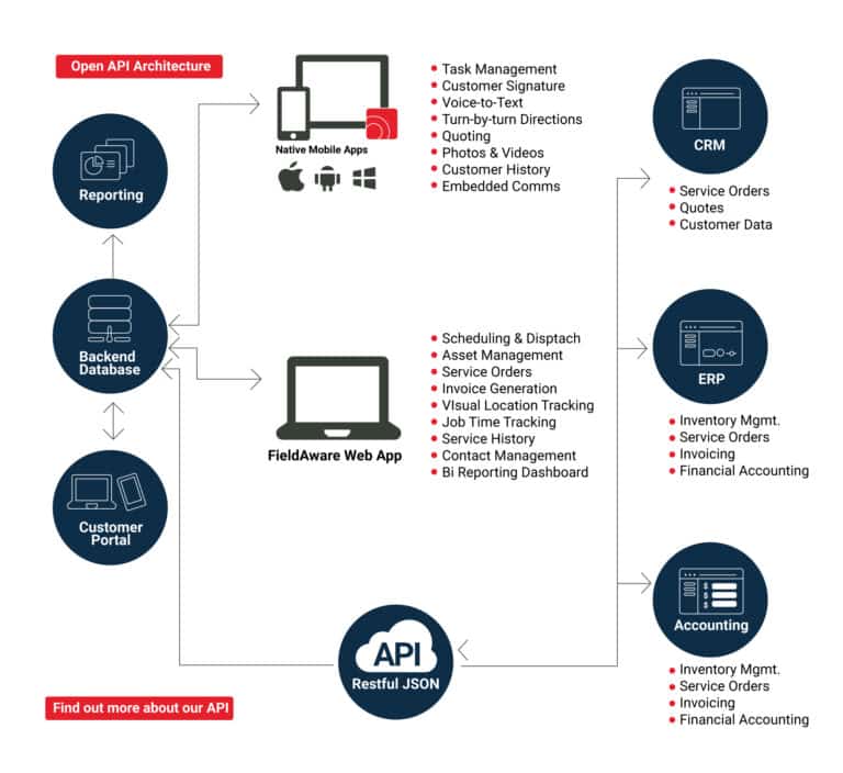 FieldAware integrates with multiple types of enterprise software solutions from ERP and CRM to accounting and POS systems. Our open architecture ensures we can connect effectively and quickly with almost any system. It is easy to choose the information you want then seamlessly share it between the back office and field with FieldAware: