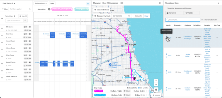 Our dispatch board includes an interactive map view that lets you see which techs are closest to your customers based on their locations. The map view takes the guesswork out of scheduling because you can see which tech is closest to the unscheduled job (shown on the map as the clipboard icons). By improving route optimization, you can reduce drive time by scheduling the closest technician to the next appointment. Real-time visibility into your tech’s location and status means you spend less time trying to locate service technicians and more time running your business.