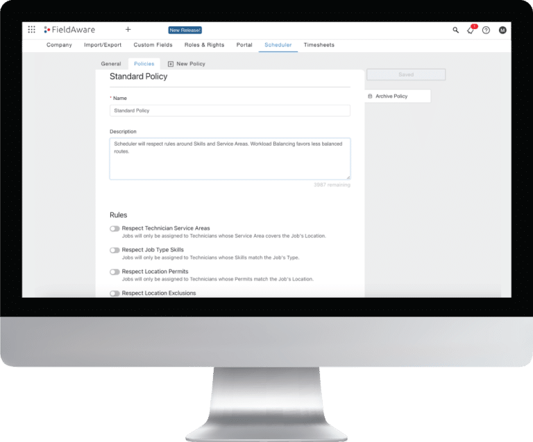 Creating optimized, policy-compliant schedules shouldn’t take hours. FieldAware’s Smart Scheduler provides route and schedule optimization capabilities stripping away the stress and applying logic to do the heavy lifting for you. Finding best-case scenarios to get the maximum jobs done with the most qualified techs are no longer a guessing game, but an absolute.